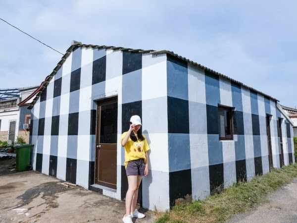 呂厝拱峰宮旁有一棟特殊的平房彩繪,當地居民利用黑白灰的配色,將原先呆板的牆面彩繪成金門傳統「花帔」的圖樣色彩,吸引許多遊客前往拍照留念!在金門流傳百年的育嬰包巾樣式,就這麼包在房屋之上,也是象徵著老社區即將重生的意義~