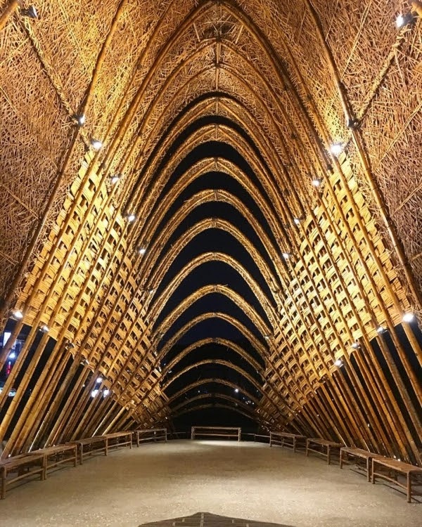 以弧形為外觀設計的竹編裝置藝術,讓人走在裡面可以感受光影從縫隙中透出,且每一步都有不同的空間感受,夜晚時還會金光閃閃,就像走在一座星光大道上!