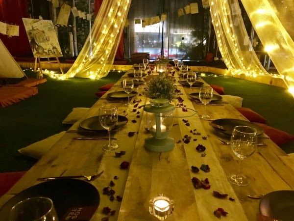 到了夜晚,為了繼續保持野外露營的風格,老闆利用漂亮的黃色燈串與紡紗的照明效果,把整個用餐區與帳篷區都變的像夜晚來臨在營火前環繞一樣,讓人不禁想要跳起營火舞、圍著營火聊天呢!