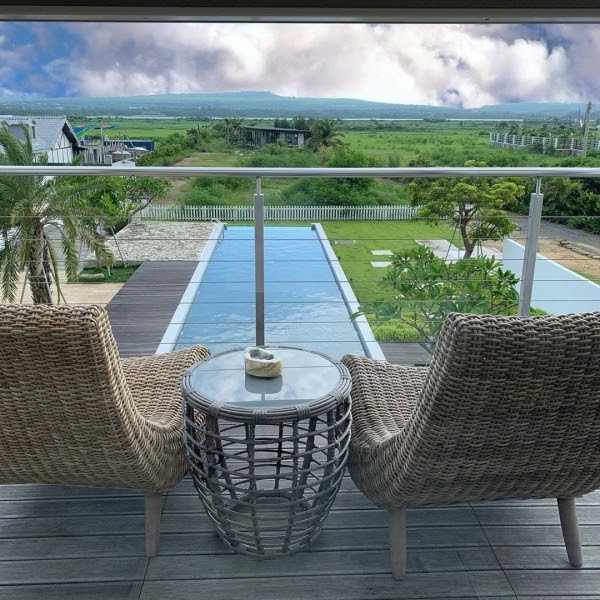 還有獨立陽台,坐在這裡可以一望民宿庭院泳池,還有南灣的美麗風景,如果和親朋好友多人來的話,建議可以直接包棟,不只可以不用管別人眼光大玩特玩,還能獨享所有公共空間!