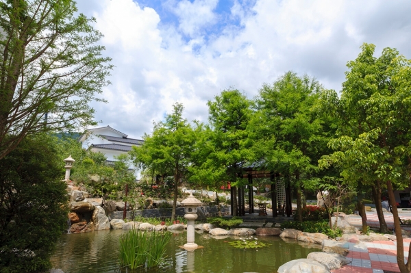園區內有近3000坪日式庭院造景,可以讓您伴著流水巨石的池塘和親朋好友聊天、泡茶、烤肉,還有露天SPA湯泉及湯屋可以洗去平日繁忙勞累,夜晚還能邊泡湯邊飽覽滿天星斗!