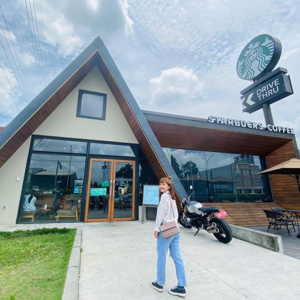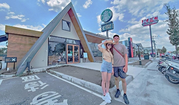 現在的星巴克門市都越來越漂亮啦!民雄店的門市外觀以黑色沉穩色調與木材交錯,建築的三角型主體及長方型副體結構,呈現既現代又古典的教堂風格。一進入大門,尖型挑高屋頂迎接,在尖塔的左右兩側,以不同的深淺層次的長型柚木條排列,像是教堂中的雙排管風琴。