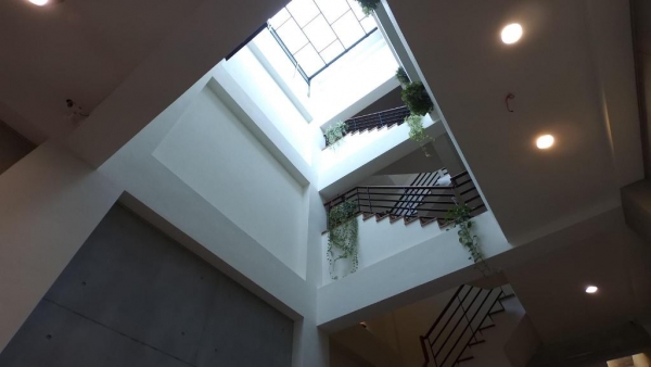 民宿老闆因為有小朋友,為了讓孩子在家裏頭玩耍也可以曬太陽,打造高聳的天井迎向陽光,同時達到空氣循環的目的,所以在【山慕藝旅】中,冬暖夏涼,自然調節的溫度很適宜。也因為室內有陽光,所以屋內的植物也能進行光合作用,呈現一種親近大自然之美。