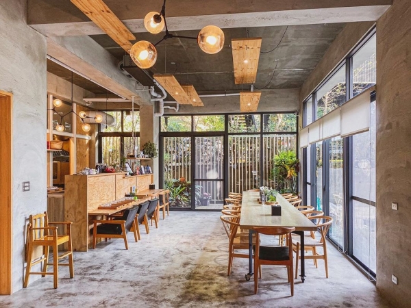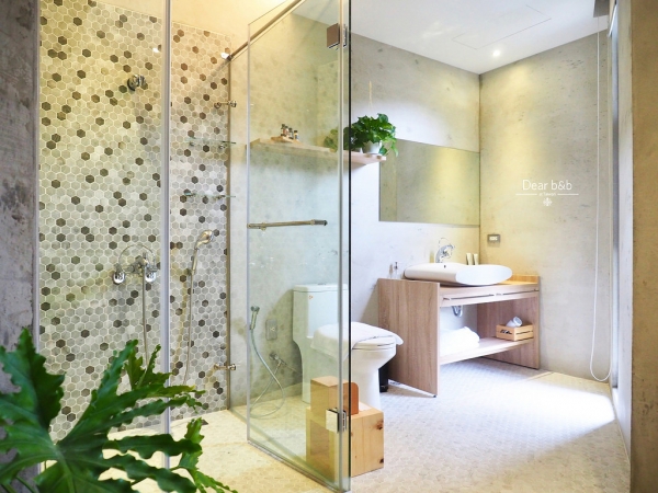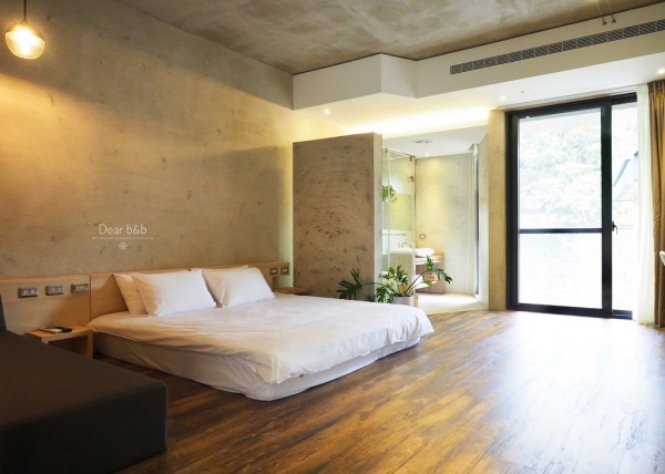 房間內同樣採用簡約設計,清水模牆面搭配深色木質地板,再點綴一兩盆植栽,讓人感覺放鬆又溫馨。