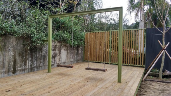而在庭院還有一座盪鞦韆,絕對是小朋友的最愛,室內設計也採高挑裝潢,不但讓小孩能夠自由自在的跑跳,也不怕受傷!