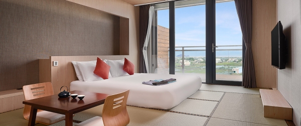 經典和室設計風格,窗外可欣賞到龜山島海景與絢麗日出與月升,自然光線灑落讓整間客房更顯朝氣明亮!