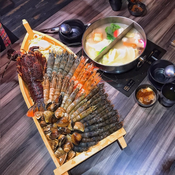 ▲上官木桶可以說是 甜蜜痛風鍋創始店,後來很多店家相繼也推出海鮮船。有滿滿的蝦子,種類高達六種!大草蝦、天使紅蝦、花蝦、翡翠蝦、小草蝦、汶萊藍蝦,附上滿滿的蛤蠣、龍蝦,丟進乳白色的鮮甜湯頭,再適合不過~