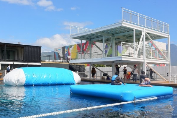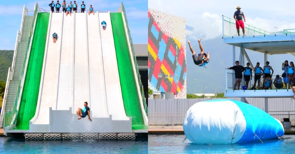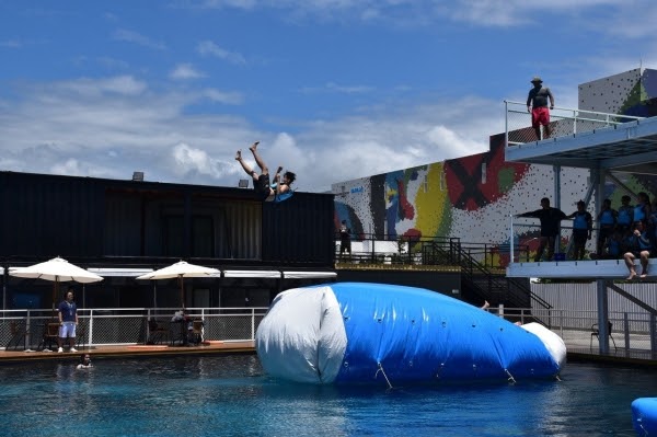 另一個讓大家超期待的玩水設施是「水上彈跳包」,從約5公尺高的跳水台一躍而下,滾到彈跳包最前端等待另一個朋友從後方跳下,前面的人就會立刻被彈飛到三米高的空中,可以和朋友一起體驗這麼好玩的設施,真的是暑假的新體驗啊!