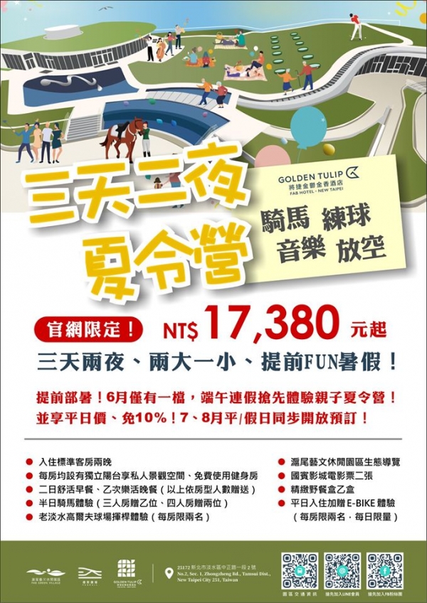 這次結合園區周邊豐富的資源,與格林馬術、真理大學、國賓影城、老淡水球場等跨業合作,規劃推出騎馬、揮桿、生態觀察、野餐等多元體驗的「三天兩夜親子夏令營」,二泊三食體驗官網價17,380元,平日入住還可騎乘E-BIKE到附近景點遊玩,例如:紅毛城、滬尾砲台、雲門舞集等人氣古蹟名勝。