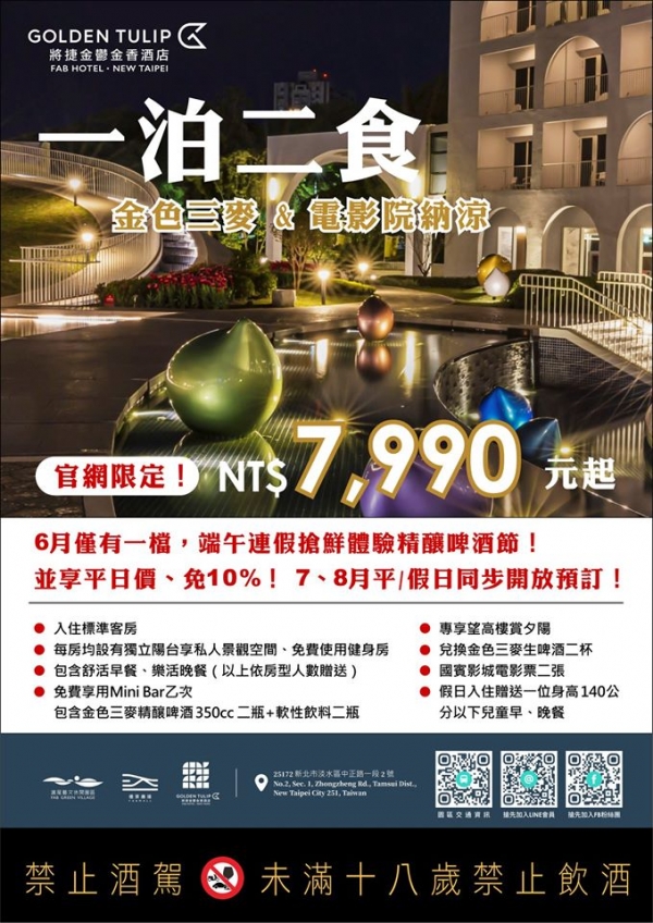 淡水滬尾藝文休閒園區於暑期7月1日至8月31日推出「三天兩夜親子夏令營」、「一泊二食夏日輕旅行」專案,端午連假即可搶先體驗。這次園區與「金色三麥」合作,首度推出「房客限定」的夏季精釀啤酒節,在打卡秘境望高樓眺望270度遼闊視野,觀賞淡水日落,一泊二食官網價只要7990起!
