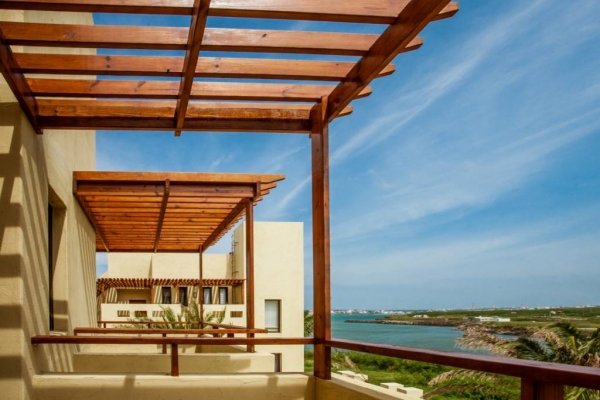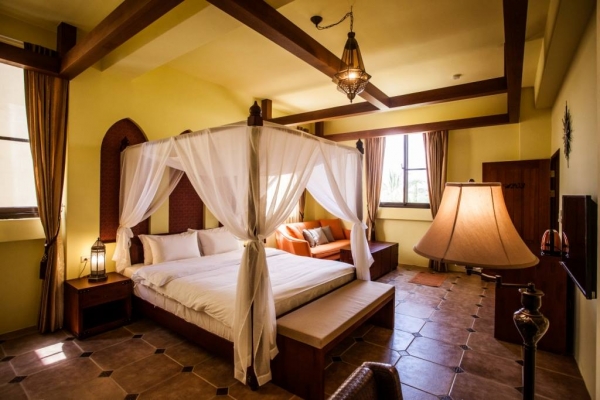 位於海島邊境的一處佇立著一棟濃濃北非風情的建築,沙漠黃的碉堡建築,周圍圍繞著許多海棗樹在風中搖曳,耳邊就像是飄出了一首中東音樂一般,踏入的異國世界。