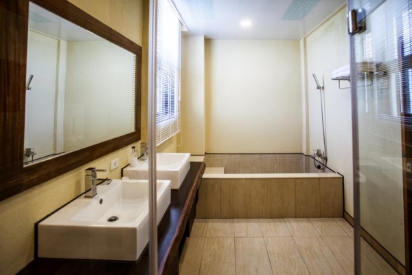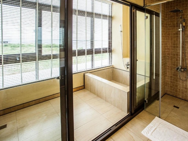 沙漠房型中最夯的就是這間海景雙人房,黃沙色的基底,搭配橘紅色調的沙發,在白紗窗簾中眺望無敵海景,還有超大窗景浴缸超享受!