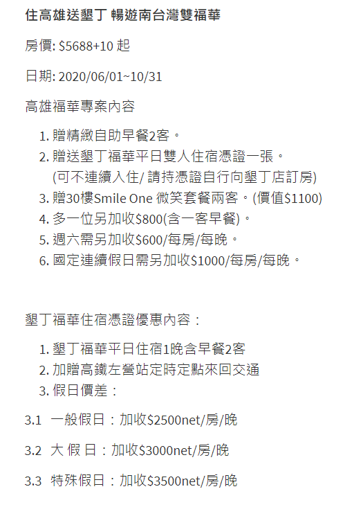 高雄福華大飯店推出了「住高雄送墾丁暢遊南台灣雙福華」超殺專案,即日起至10/31,只要入住就送墾丁福華飯店住宿券1張,只需5688元就能爽住兩家飯店,還不侷限高雄、墾丁連住兩晚唷!