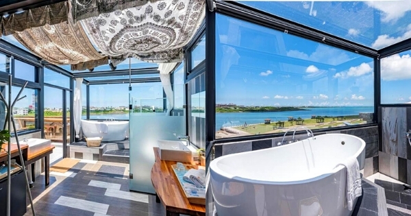 有著大片的落地窗以及陽台可眺望海景,還有巨大雙人窗景浴缸,來度蜜月就選這款!