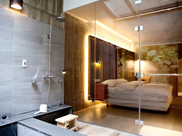 房間寬敞,和一旁的溫泉池只隔著一片玻璃,很適合新婚夫妻來度假喔!