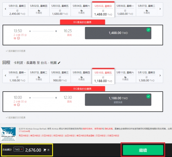 ▼Step 3.選完日期之後會跳到以下頁面,只要確認左下角的金額是不是滿意的價格,接著按下繼續。亞航直飛長灘島的航班為兩天一班午去早回,以這個價位來說時間還算不錯,畢竟一分錢一分貨囉!