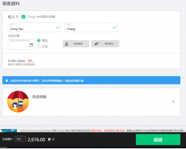 ▼Step 5.輸入各人資料,旅遊保險一定要買!旅遊是一件突發狀況非常多的是事情,花少少的錢以備不時之需有好無壞!