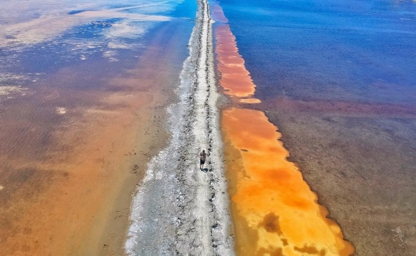 想看彩色鹽灘景觀不用跑去國外,來七股就能目睹這種奇景啦!在頂山的廢棄鹽灘地因海水引入鹽田,久旱不下雨,蓄積的海水長期受陽光照射蒸發所形成,成了高濃度鹵元素水,有的還積聚成鹽!