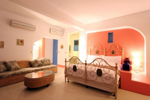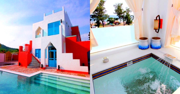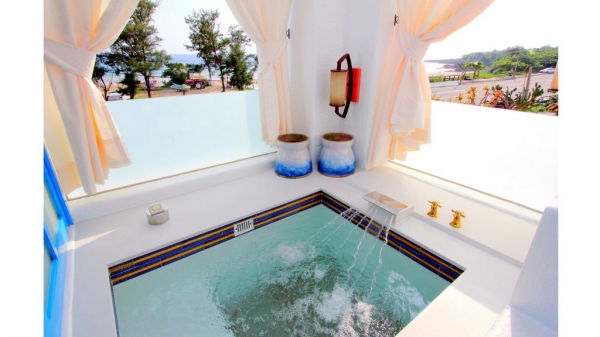 整棟建築以橘白色調為主,高檔的城堡別墅,皆用非常飽和的顏色,看了心情很愉悅,位在絕佳賞海景的第一排,要在民宿內玩水泡湯還是戶外直接踏踏海水都可以!
