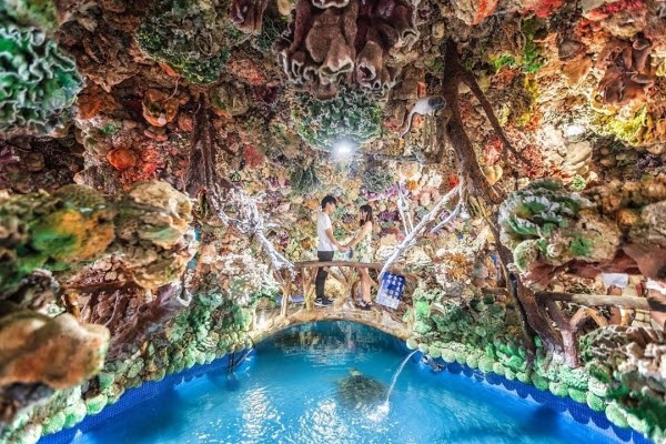 宮前有座馬僮牽著赤兔馬的關公塑像,高度約有2層樓高,遊客經過賽錢箱後往下走就是地底岩洞,內部以珊瑚作為陳設的材質,加上五彩的燈光、虛擬的情境。