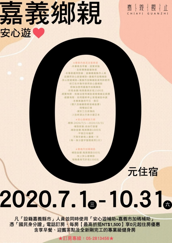 限量"0"元住宿專案(安心旅遊補助+嘉義市政府加碼+振興三倍券)