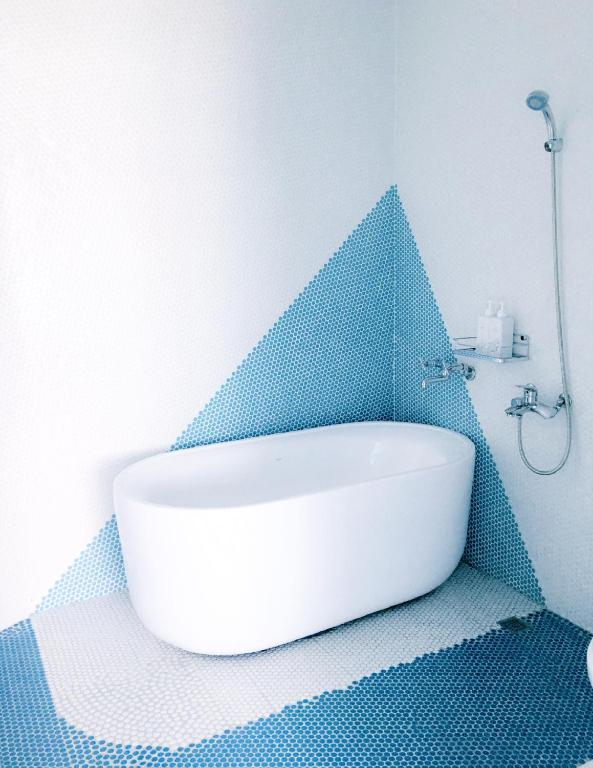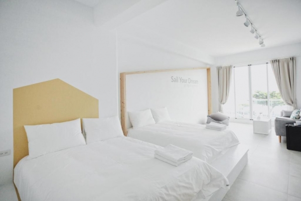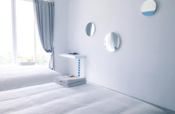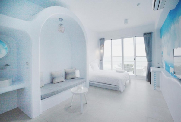白藍的配色一踏進房瞬間清涼了起來,一望無際的大海是最療癒的風景。