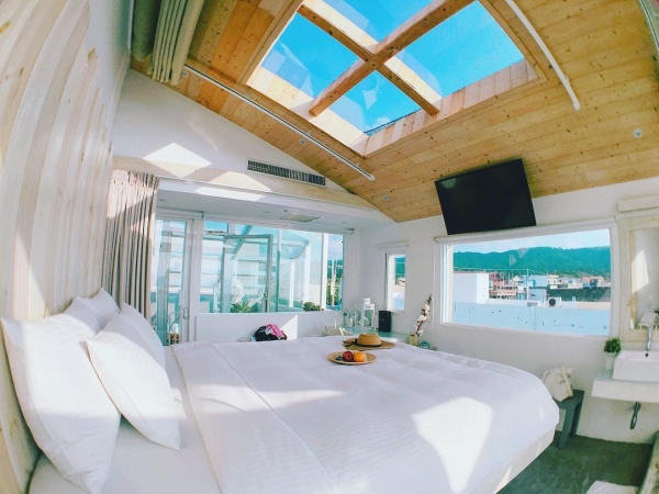 再來就是最搶手的三樓全海景雙人VIP房,房內採挑高無隔間設計,躺在床上就能望藍天、夜晚賞滿天星空,是不是超棒的!