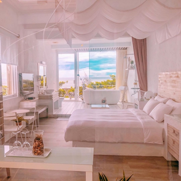 一樓的全海景雙人Villa,房內採純白色與木質藤編打造,有種讓人有置身在海島的錯覺!