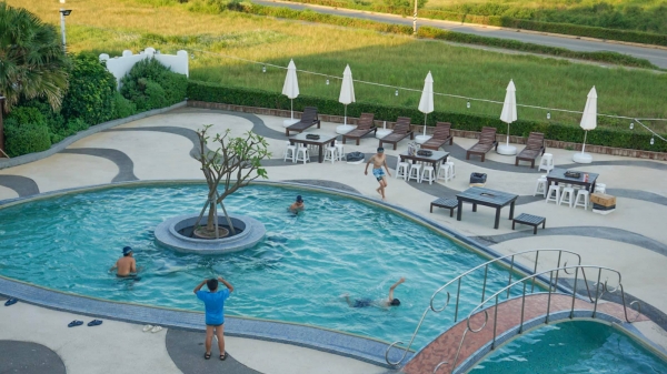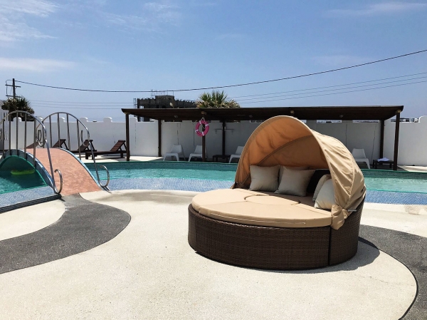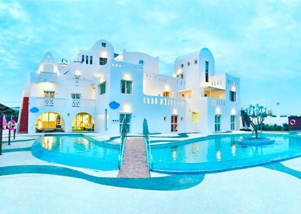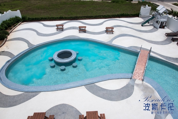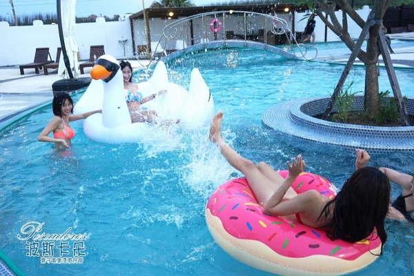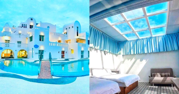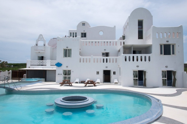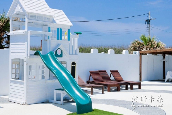 民宿外觀以城堡為主題打造,戶外還有一座大泳池可以玩水,且設計了超多豐富的娛樂設施,不管大人小孩都玩得非常開心!
