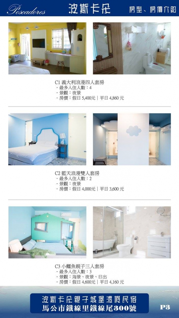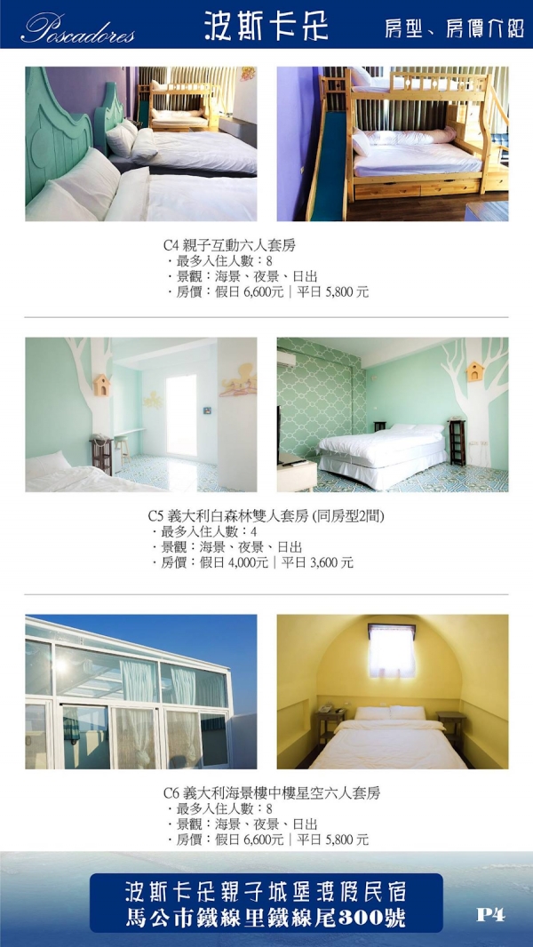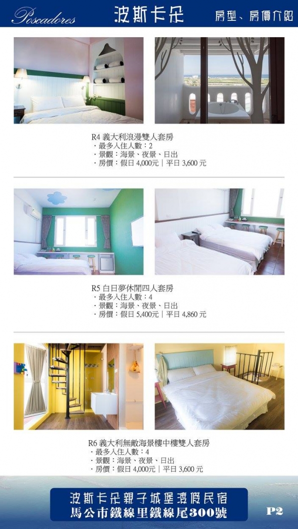 位於澎湖馬公市區的「波斯卡朵親子城堡度假民宿」在山水海灘不遠處,離機場也僅需5-10分鐘的車程,雖然民宿不在沿海,房內卻能一覽無敵山海景、日出日落,完全不輸給一般的海景民宿呢!