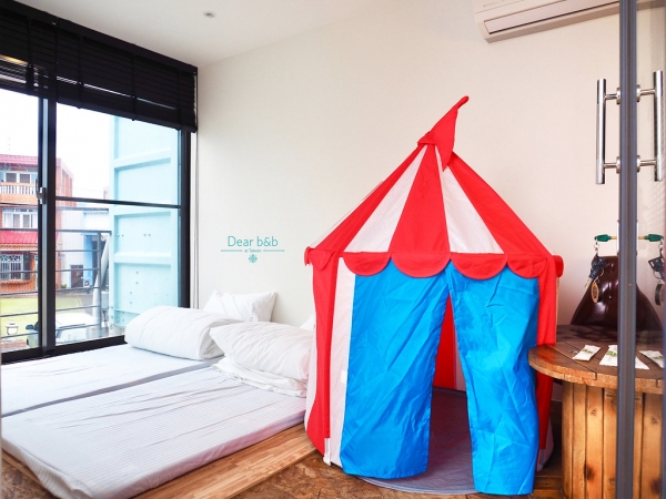 簡約的工業風包棟房型,可入住8人,雙層樓設計,美式大客廳還有專屬廚房,設備應有盡有,也備有親子房型,馬戲團小帳棚超可愛!