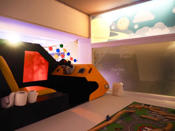 充滿外太空元素的一間夢幻親子房,小男孩小女孩一定都對外太空感到非常好奇,除了壁貼以外,還有立體星球、火箭等裝飾,還有樓中樓設計,住進太空艙!實在是太棒啦!