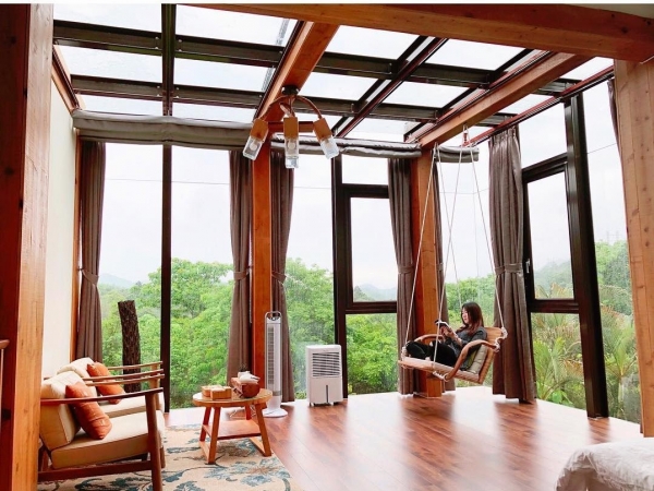 位於新北平溪半山腰上一間山林環繞的玻璃屋,以大片落地窗打造而成,寬敞的草坪搭配旁邊的繽紛花草,讓人不自覺沉浸於大自然的懷抱中,特別放鬆!