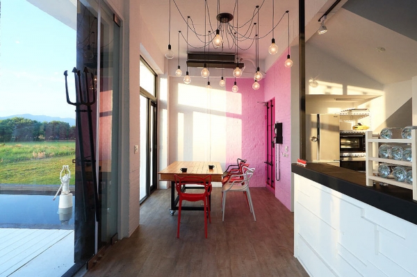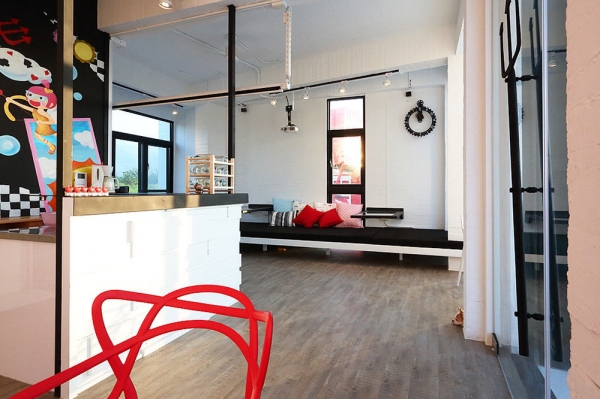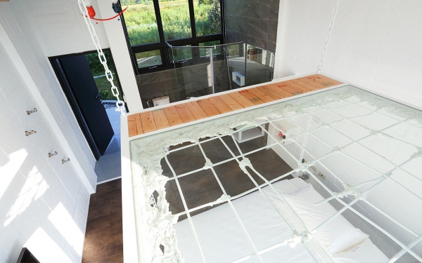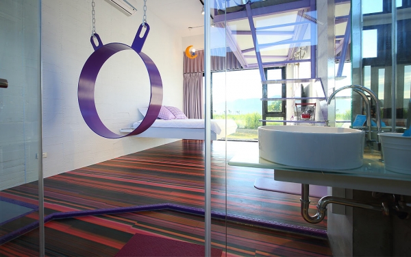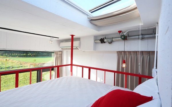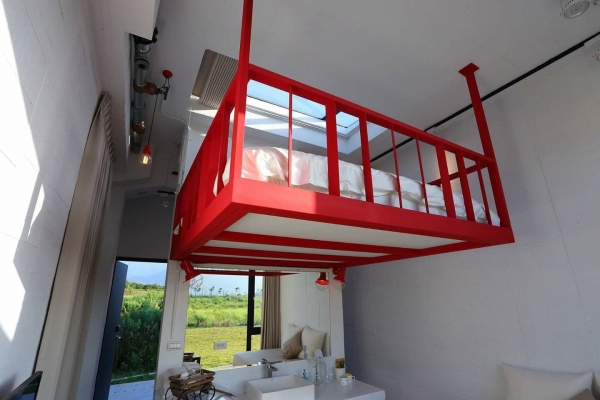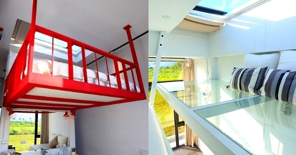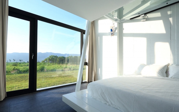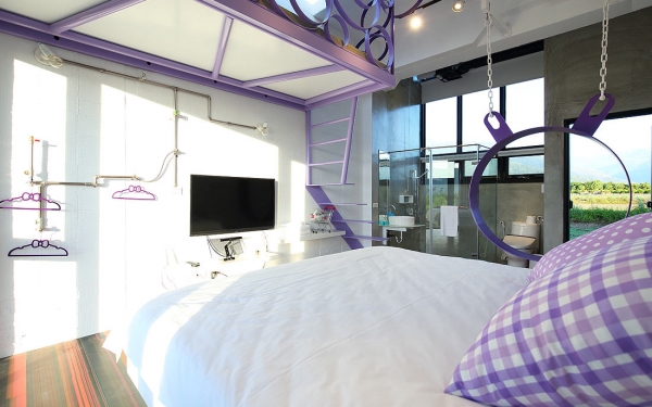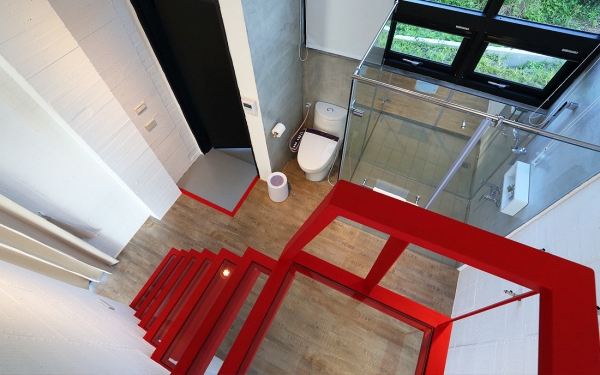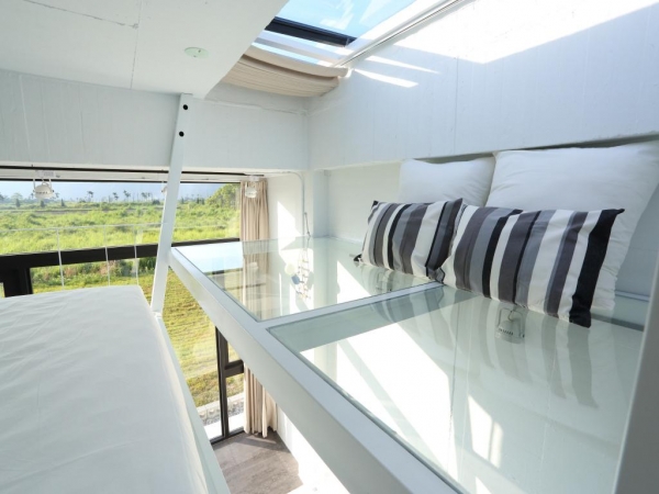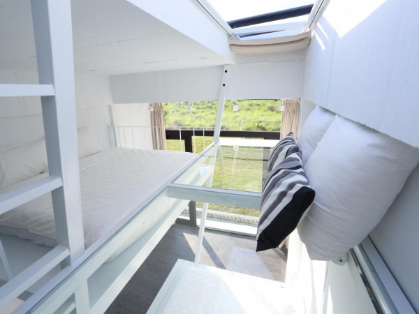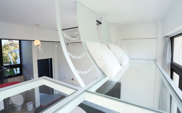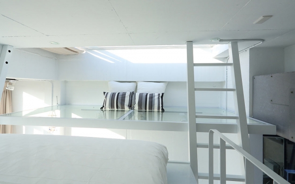 Z字型的床舖設計,簡約純白色及透明玻璃閣樓設計,非常時尚!廁所以大片拉門做隔間,粗獷味十足,衝突的美感達到一種微妙的平衡。