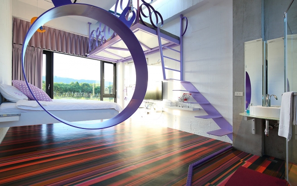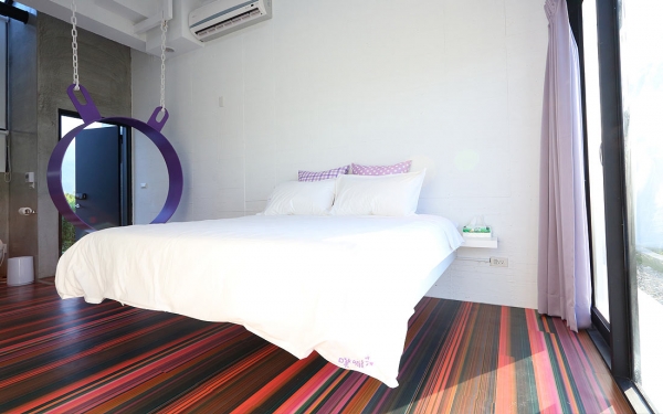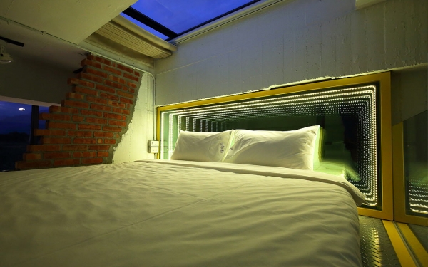 以鏡面燈光反射創造出有魔幻的臥榻、驚奇的床頭及天窗與星星共眠,懸空、造形樓梯及紅色懶人圈,歡迎來到「Create雙人房」!