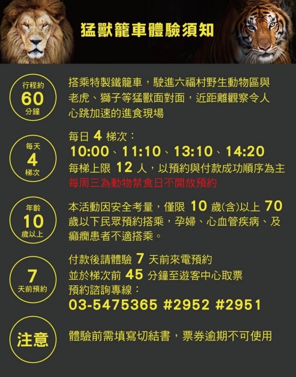 【 暢遊六福村 + 全台首創4D猛獸籠車體驗 】,人獅角色互換,人關籠前進猛獸區,與嗜血的獅虎猛獸們零距離接觸,觀賞獨家猛獸餵食互動秀!
