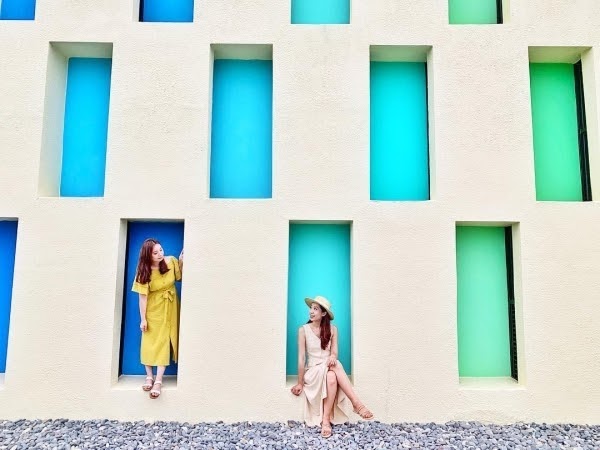 擁有漸層色玻璃窗的純白建築物,是田埔水庫旁的引水工程閥室,因繽紛獨特的外觀,成為超夯打卡點,每個窗戶都能塞進一個成人左右的大小,不管是多人拍、個人拍都可愛的啦!