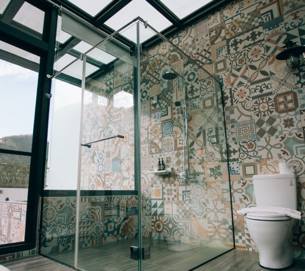 還有個利用幾何圖樣磚牆打造出來的獨立空間,露天玻璃帷幕的衛浴空間是這間房最大的特色,還有沙發可以躺著望窗外景色唷!