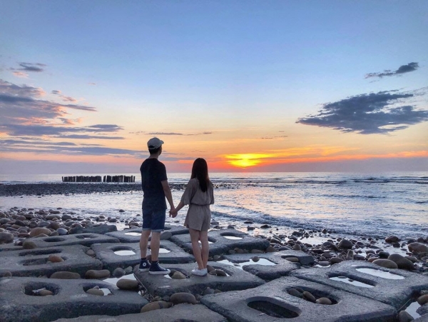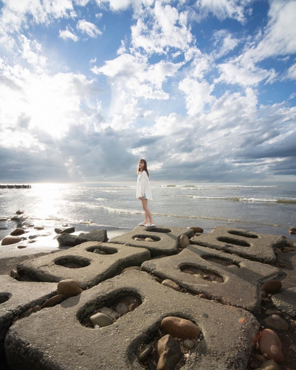 位於竹圍漁港旁的超療癒海灘秘境,一塊塊特色的消波塊近看像數字8,橫看則像豬鼻子,相當趣味!夏季時還有限定火燒雲及夕陽海景,因此吸引了許多攝影玩家前來拍照!趁著假日來漁產中心吃完海鮮時來這邊散散步吧!