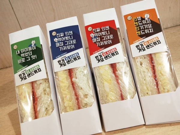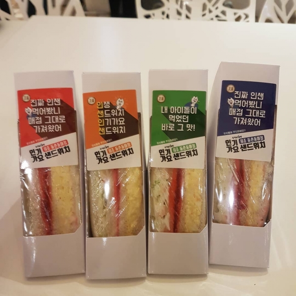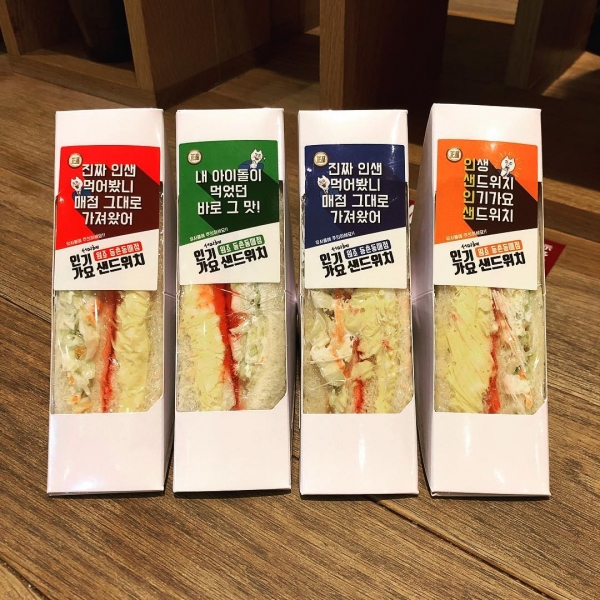 人氣歌謠三明治都是現場製作,三層餡料有蟹肉、蛋沙拉、韓國草莓果醬,以及生菜沙拉,另外製作沙拉的美乃滋也是從韓國進口來台,就連外包裝也很韓,簡直將原汁原味都搬來台灣啦~