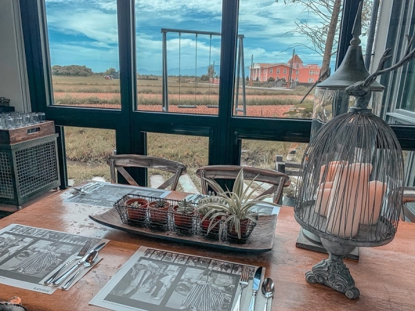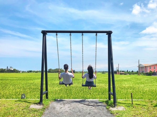 戶外一望無際的稻田,中間佇立了一坐雙人鞦韆,也是來這裡必打卡的景點之一,盪著鞦韆,吹著微風,望向綠色稻浪,好愜意阿!