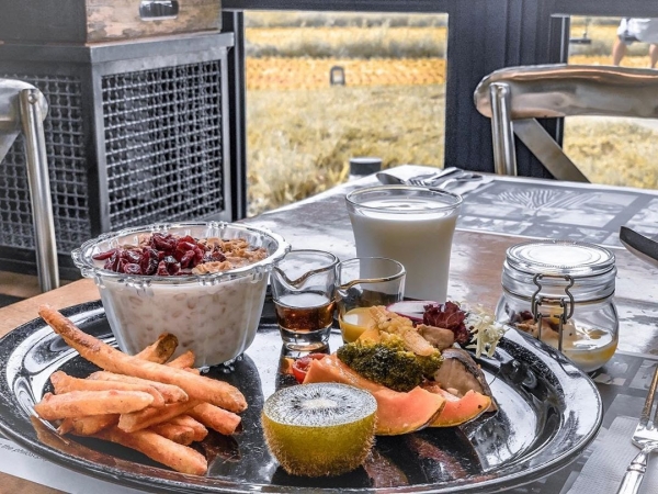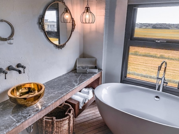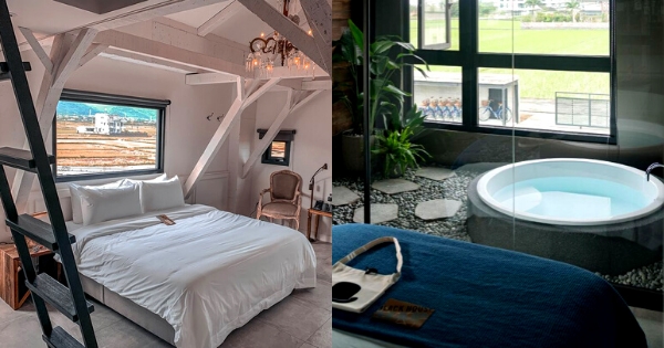 落地的玻璃窗,讓陽光、月光自然灑落,微風、草香輕拂吹入,一睜開眼就可以沐浴在鄉間大自然的懷抱。單間雙人房,有獨立客廳、衛浴,更特別的是半露天庭園,以及療癒感十足的圓形浴池。