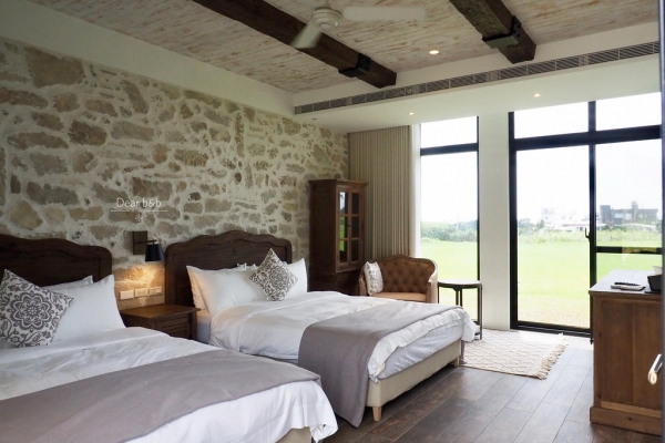 這裡共有九間房,同樣歐式鄉村風格的雙人、四人房,以原石質地相搭沈穩的木頭家具,並留有浴缸,任妳眺望一窗戶外美景。