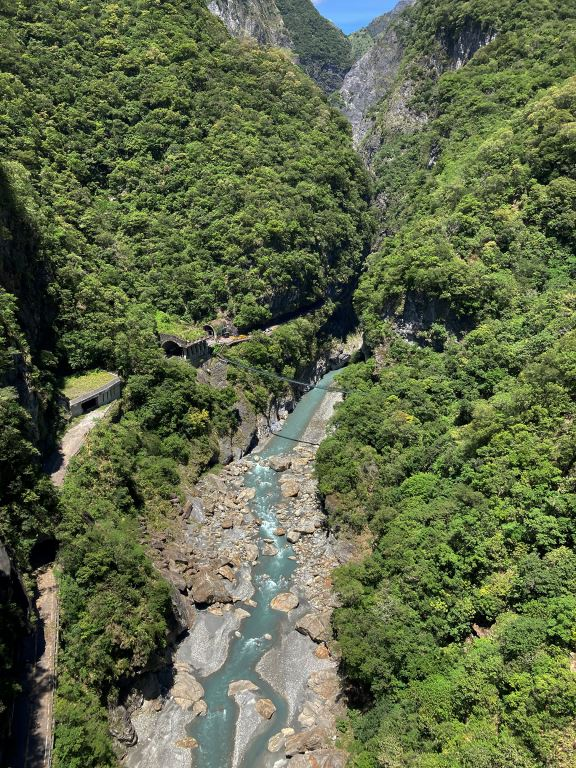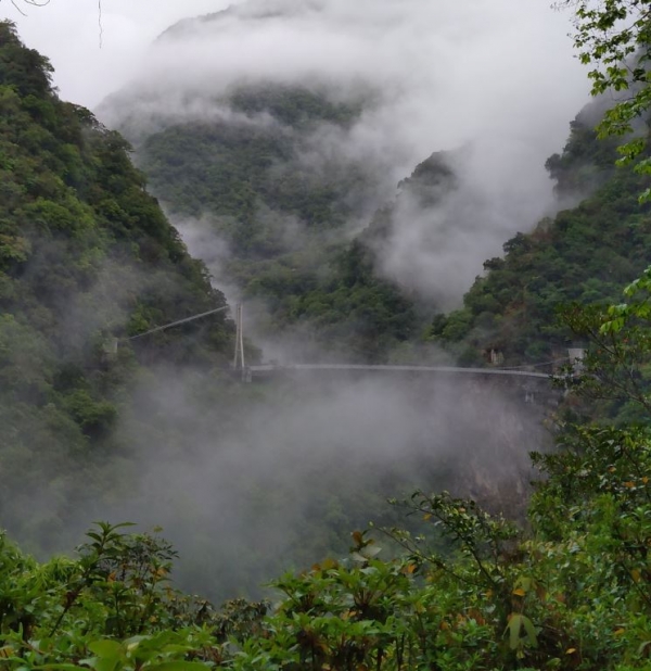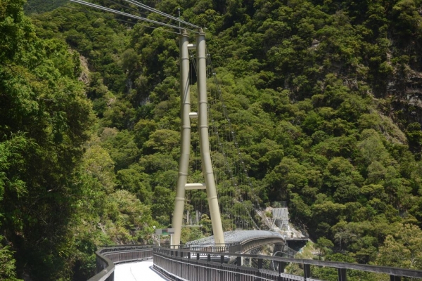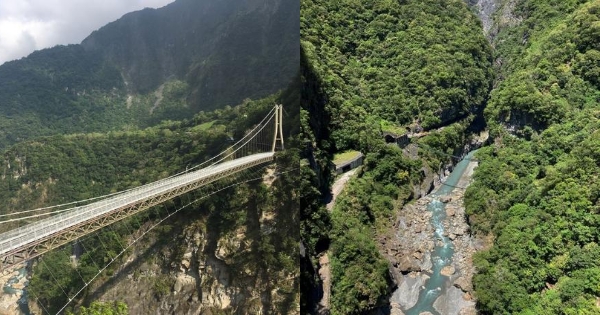 從布洛灣伊達斯廳旁邊的步道走進去,可以來到山月吊橋。橋長196公尺,橋面寬2.5公尺,距離溪谷約152公尺,從布洛灣臺地邊緣跨越立霧溪谷,是太魯閣國家公園跨距最長、距離溪谷落差最大的吊橋,從橋上俯瞰,立霧溪蜿蜒曲折,而兩岸山勢陡峻,層層相疊,視覺可以從溪谷向上延伸至遠山。