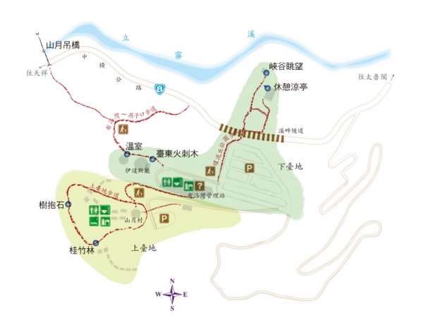 從伊達斯廳至吊橋北岸平臺地步道全長500公尺,均為無障礙步道,輪椅及嬰兒車都可暢行無阻。