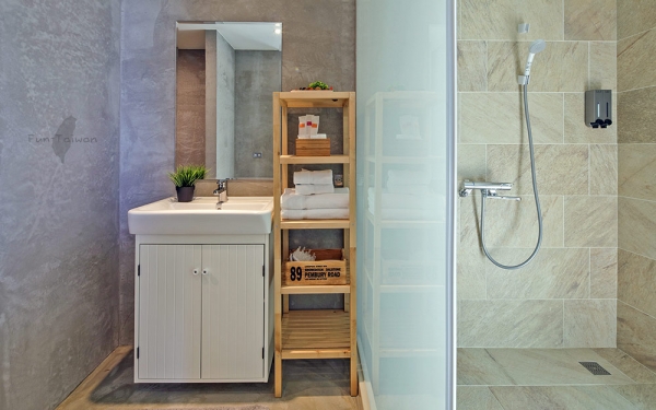 清水模底的背景,給人一種文青卻又不失質感,一走進來一定會被地上那超顯眼的斑馬紋地毯吸引住,非常有特色,而盥洗台與浴室分離,使用上更為方便!
