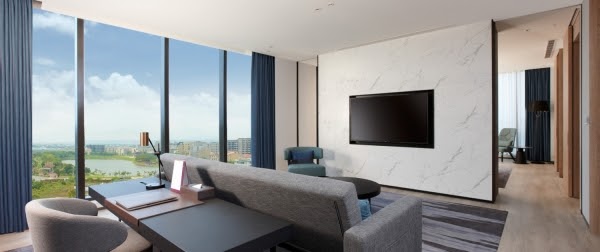 房型部分有許多種,每間都採用大片玻璃落地窗設計,寬敞舒適、採光佳,牆上還有藍鯨、鯨鯊的裝飾掛畫,最吸睛的是還能24小時觀看Xpark水族館直播畫面,讓你彷彿置身在海洋之中!