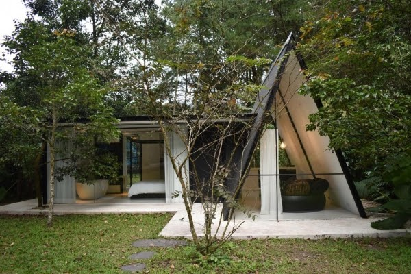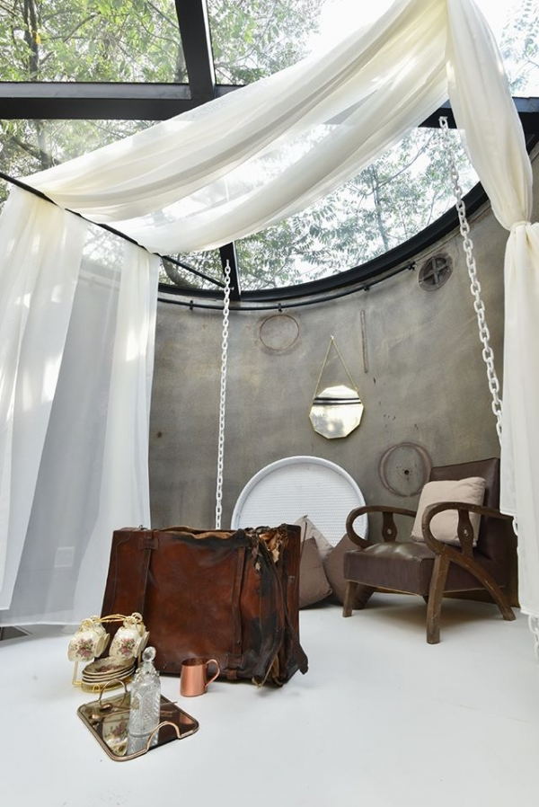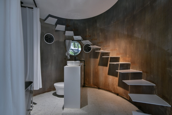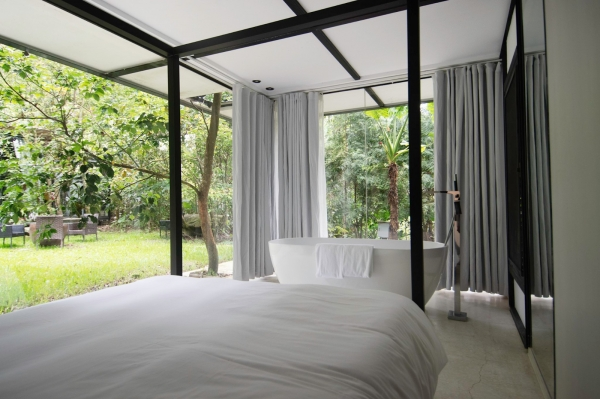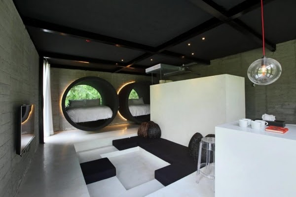 還有利用清水模打造而成的水管屋,可透過床頭的玻璃望向樹林,還有地陷式的小客廳,真的是好享受啊!