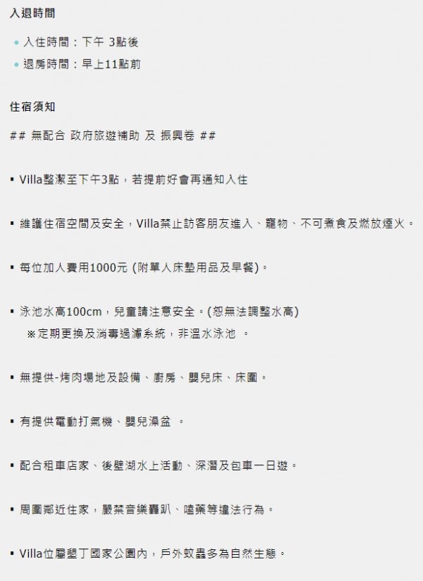 位於墾丁的一間絕美Villa,提供了各種主題房型,皆為私人空間設計,每一棟都能獨享大泳池、花園、浴缸、躺椅、早餐及停車場,讓你盡情享受度假!