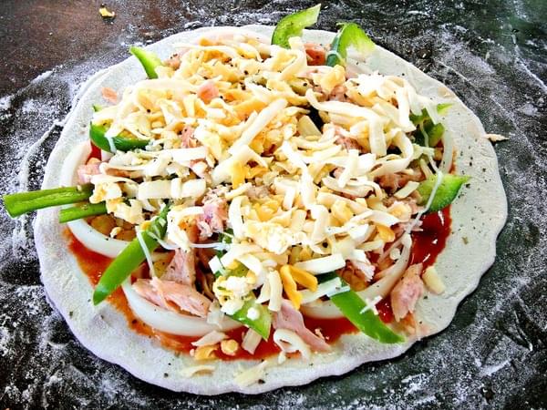 柴燒窯烤披薩DIY,搓揉麵團,用擀麵棍將麵糰擀出適中的大小,塗抹上番茄醬 擺上洋蔥 青椒 玉米 燻雞 起司 黑胡椒 美乃滋。